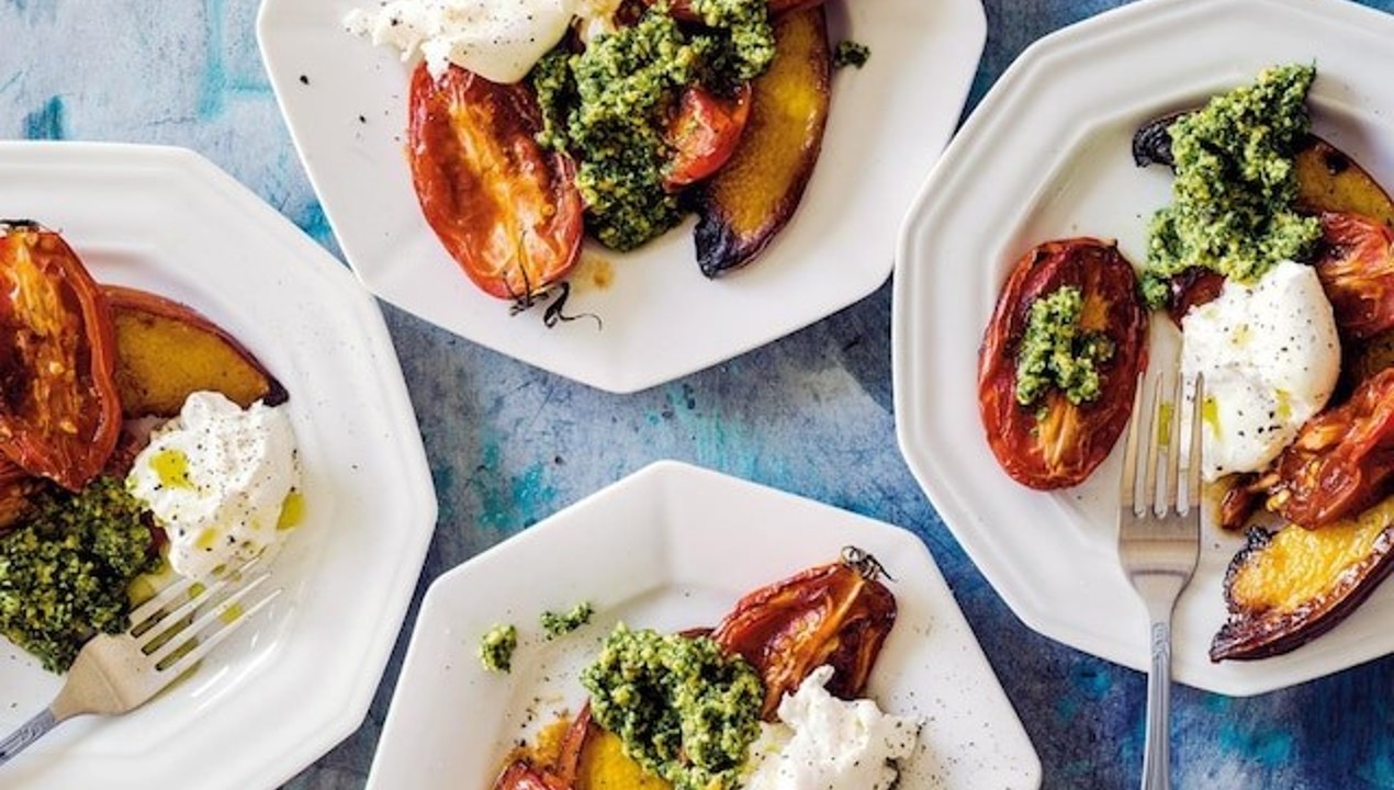 Rudeniškos keptų moliugų, burrata sūrio ir pesto salotos